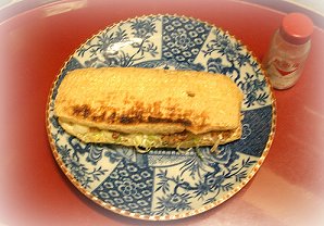 日本一の大きさ? 食卓塩は大きさ確認のために置いてみました。 ほんとはお醤油をかけて食べます。 栃尾市の食事処へ行くと、一人前がどーんと一枚。 食べきれなくて、うちでは2〜3人前分です。 納豆、ねぎ、かつおぶしをはさんでみました。
