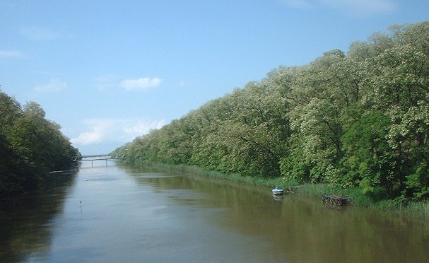 両岸は にせあかしやの花ざかり。そしてこの先は海。外国航路の船が見えました。