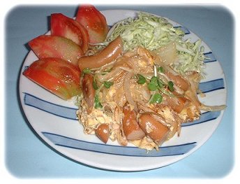 ウインナーと玉ねぎの玉子とじ、トマト、きゃべつ添え