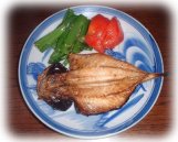 あじの干物、アスパラ菜のひたし トマト