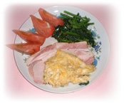 目玉焼き、ハム、トマト、アスパラ菜のおひたし