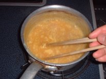 A卵を温めた鍋に注ぎ込む (油は使わない) 焦げないようとろ火で、 ゆっくり、かき混ぜる。 B半熟状態で鉢に盛る。