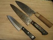 包丁3種。たいてい手に丁度いい一番小さいのを使う。キャベツやかぼちゃや刺身には牛刀、鰤や鮭は出刃包丁。あまり使っていないのはサビだらけでバレバレ。