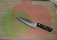 アフタヌーンティ(三越デパート)のプラスチックまな板と刃渡り13.5aの廣朋(三条市)のペティーナイフ。包丁は15年以上愛用。前はコメリやランドにあったのに、今は何処にも売っていないので製造元から直接取り寄せています。