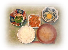 昨日の夕方、御飯の仕度前に小腹が空いて、朝の残りの生卵を御飯にかけてパクついたら、おなかがキリキリ、朝までトイレ通いでした。やっぱり相性のわっるい「卵」。それで、朝は各自。ハドソンは絶食療法中。