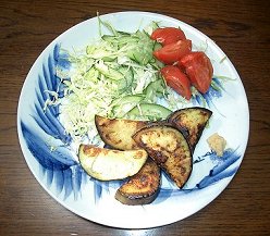 皿は骨董市でK子さんのアドバイスで買ったもの。「安いけれど真ん中にお料理が載ったときのことを考えるとお買い得よ。」とにぎりこぶしを皿に載せてみせてくれた。なあるほど、それからは見習ってます。濃い藍色の染付や印判にばかり目がいっていましたが、焦げ茶のテーブルに、この白い余白が映えて、重宝しています。25cmの大皿で、当時¥1500でした。もう、ひと昔。