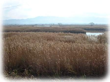 11月19日 潟周辺は枯草色になりました。うっそうとした葦の原を同行してくれる人がやっと来訪。観察小屋の雁晴舎まで足を伸ばしてきました。湖の周囲の、広々とした風景の遊歩道から、葦がしげって先が見えない小道にはいります。続いて、板橋が湖水の上を渡してありますが、ギシギシ鳴って、手すりは朽ちていてちょっと心細いです。とても静かです。水鳥たちはのんびりと水面で昼寝をしているのですが、岸辺を通ると 一斉に飛び立ってしまいます。いくら そっと近づいても見破られてしまうのです。さすが、野生の鳥ね と感心しました。