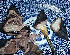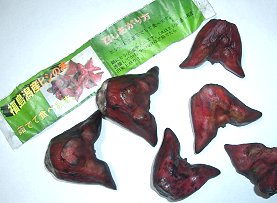 わくわく広場で売っているヒシの実 福島潟に自生するヒシは渡り鳥の天然記念物おおひしくいさんのために人間は採集禁止だそうで、これは栽培種。元葛塚人のk子さんによると、昔の物はもっと小さくてやわらかかったそうですが15分塩ゆでにしてもカラが柔らかにならないのがありました。それで二つに割ってほじくって食べました。甘みのない栗か水気のある百合根という食感で、ついつい半袋たいらげ、食べ過ぎでおなかをこわしました。元白根人のm子さんは土手で拾った記憶があるというのですが、ビュー福島潟の展示に寄れば、水中に成る実です。