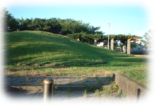 反対側から見た公園。この町の公園は どこも まあるい芝の小山があります。