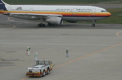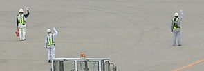 いってらっしゃーい! と手を振る整備員。45度のおじぎをしている日もあります。 はじめて見たので驚いているんですが、どこの空港もこうなのかしら。
