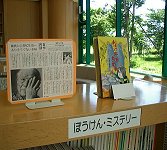 書架の上には、新聞の切抜きを色画用紙に貼って本の紹介、いいね。(これは水木しげるの『おばけ宇宙戦争』) ↑
