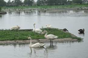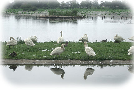 シベリアからの白鳥渡来地の瓢湖(お隣の阿賀野市水原)に、夏だというのに30羽ほど白鳥が残っています。寝ているもの、毛繕いをするもの、泳いでいるもの、思い思いの姿で30度の炎暑をしのいでいます。怪我をして帰れなかった鳥だとか・・・。みている方は涼しげで、ほっとしますが。