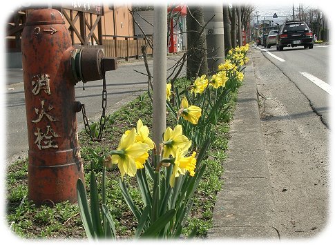 柳原のバス通りは水仙が満開。踏切前の渋滞地帯ですが、イライラが少し和らぎます。