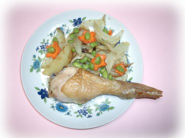 日南鶏のロースト:こんど自分で作る?一番簡単な料理なんです。塩・胡椒してオーブンにいれるだけ。野菜も一緒に入れる。250度で裏表20分ずつです。裏にしてから醤油をたらすと風味がいい。予熱してからオーブンにバターを塗ると風味がいいよ。