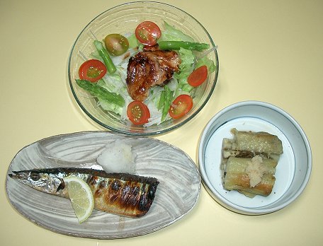 新さんまの塩焼き:買出しに行った原信で生のさんまを見つけました。1匹290円。(月初めに見た時は600円でした)少し小ぶりですが、このくらいで、ちょうどいい。