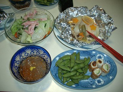 まじめな夕ごはん 鮭のホイル焼き:アルミ箔にバターを敷いて鮭、玉ねぎ、にんじん、しいたけ、きぬさや、レモン、を入れて、塩胡椒を振りかけて閉じる。オープントースターで20分。これでOK。 あとは枝豆を茹でるくらいしか火は使っていないから。、やっぱり手抜きかな。 サラダ:レタスが主 ちくわ:甘いピーナツ味噌、きゅうりをつめた。キュウリの方には醤油をかける。 ところてん:日持ちがするタイプを買い置きしてあった