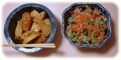 サラダはブロッコリーと、くらげ(市販の袋入りを水で戻して切ったもの)と、浅野さんのスモークサーモン。ドレッシングはいつもの醤油2サラダオイル1の自家製。