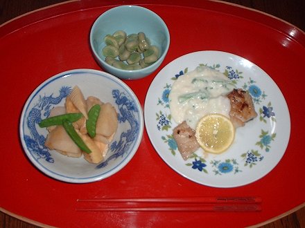 メインは生鱈のホワイトソースかけ。ウオロクに生の鱈が4半身298円で、でていた。透きとおったうすピンクですばらしく活きがよかった。活きがよくて安くて大変けっこう。