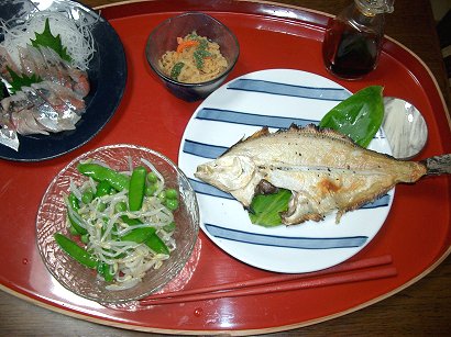 6月6日の 夕ごはん口細ガレイの塩焼き 鰺の刺身(ウオロク¥298) 茹で野菜(グリーンピース、絹さや、もやし)は醤油ドレッシングで。 切り干し大根のたらこあえ(これはウオロク製)ばれているのか売れ行き悪し。 きょうはレシピのいるようなメニューはナシ。 いよいよワトソンさんの実習始まる。おそろしいことに、生徒がちゃんと教えろと先生を脅迫しているもよう。