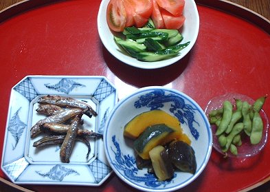 かぼちゃと茄子の煮しめ:かぼちゃは面取して(=煮くずれしないように角を落とすこと)、茄子と水から煮る。茄子に透明感が出てきたら煮えた証拠。砂糖と醤油で味を付ける。甘めの方が日持ちがするよ。