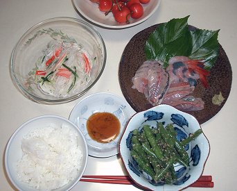 春雨サラダ は、きゅうり、トマトの千切り、かに蒲鉾入り。味付けはマヨネーズと醤油を混ぜたドレッシング。