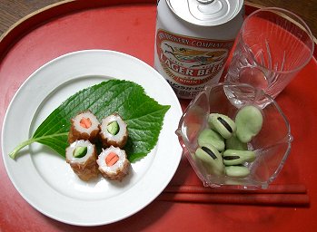 ちくわに朝の塩鮭の残りをつめこんだものときゅうりの4分の1をつっこんだもの。 それと3日目のそら豆。 あとから、山ぶしガレイの煮付けをお出ししました。